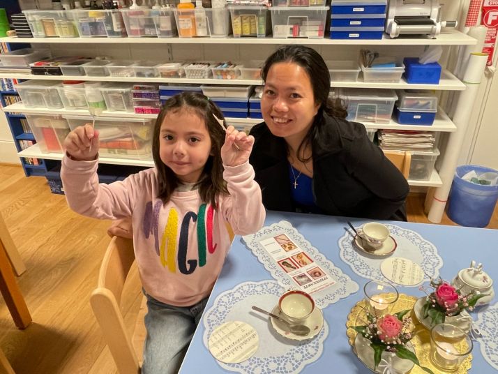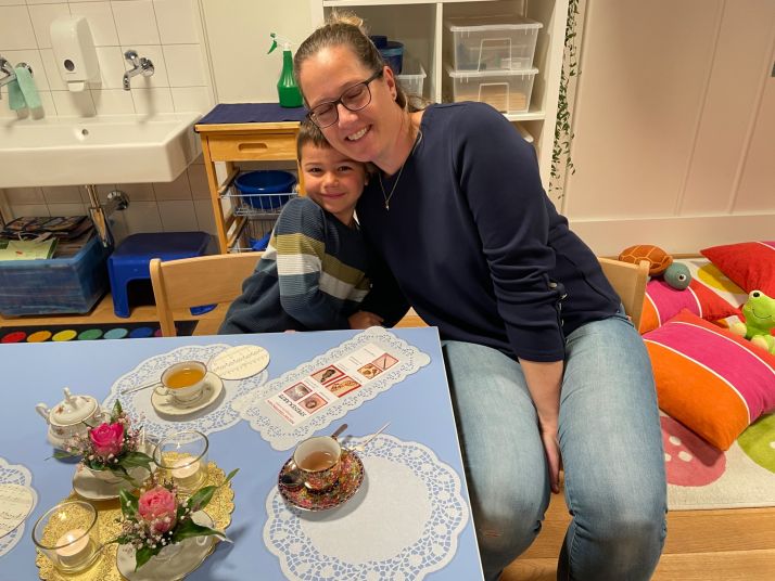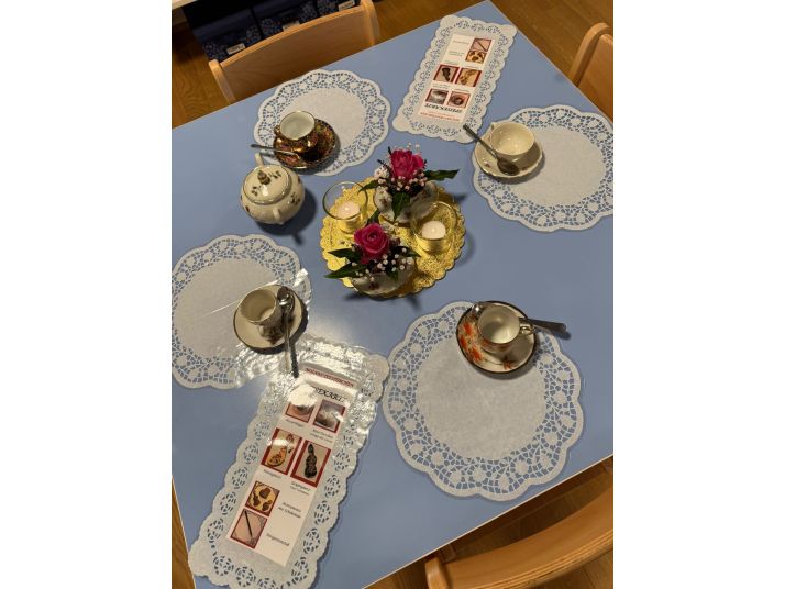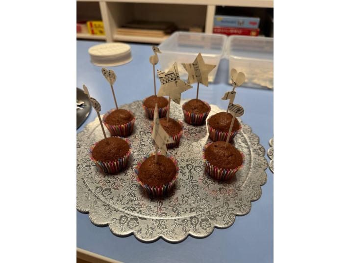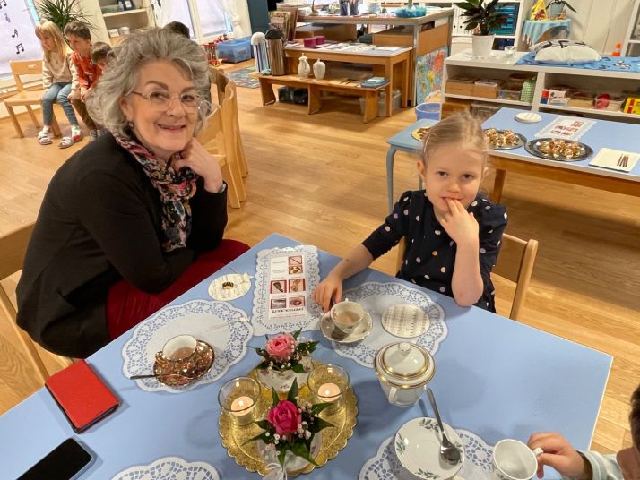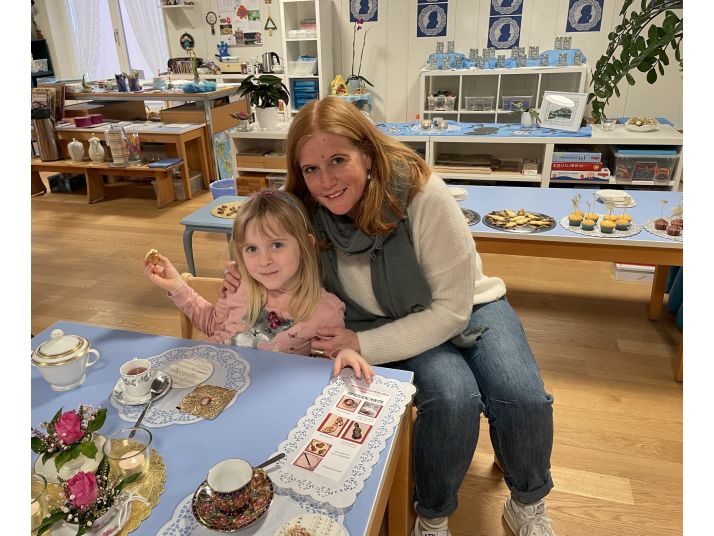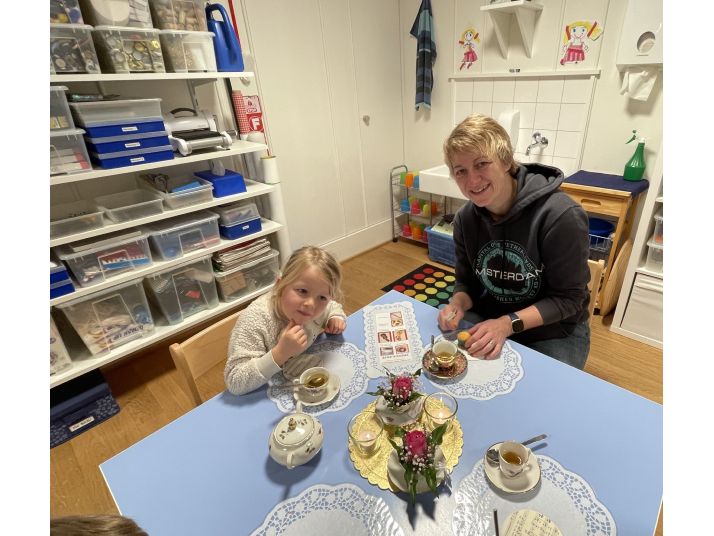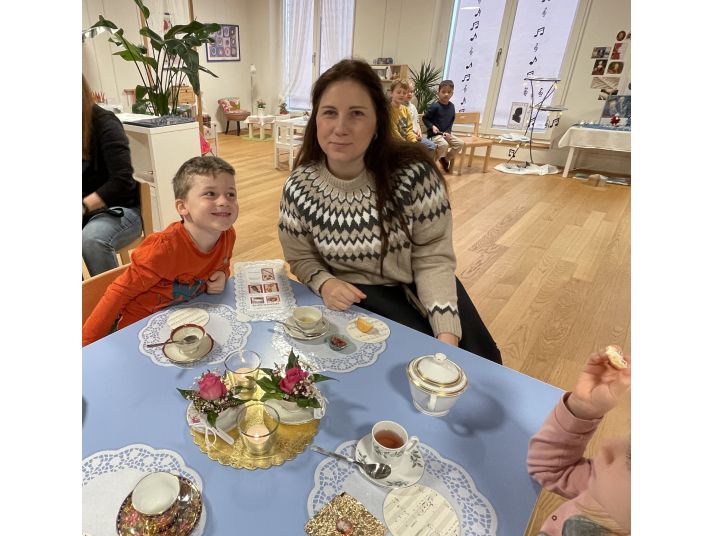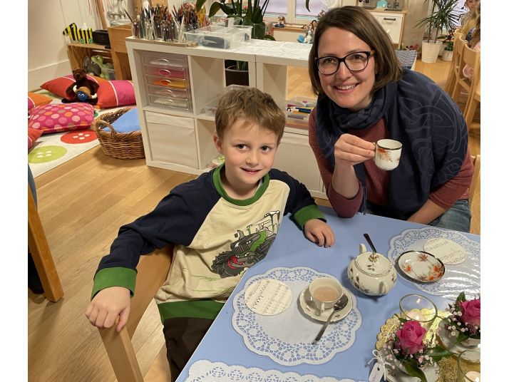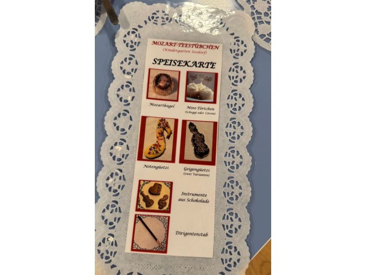 Als Höhepunkt der Mozartzeit durften die Kinder einen Gast in unser «Mozart-Teestübchen» einladen. Im Vorfeld wurde ein «musikalisches Buffet» vorbereitet, Tee gekocht, eine Blumendekoration für die Tische gesteckt, Speisekarten gemacht, stilvolles Geschirr gesammelt, Notenpapierteller hergestellt und einige Lieder eingeübt. Die Freude der Kinder und der Gäste war an allen drei Teestübchen-Morgen sehr gross! Mit Eifer wurden die herrlichen Kleinigkeiten vom Buffet herausgegeben, serviert, gegessen, dazu etliche Tässchen Tee genossen und der musikalischen Einlage gelauscht!